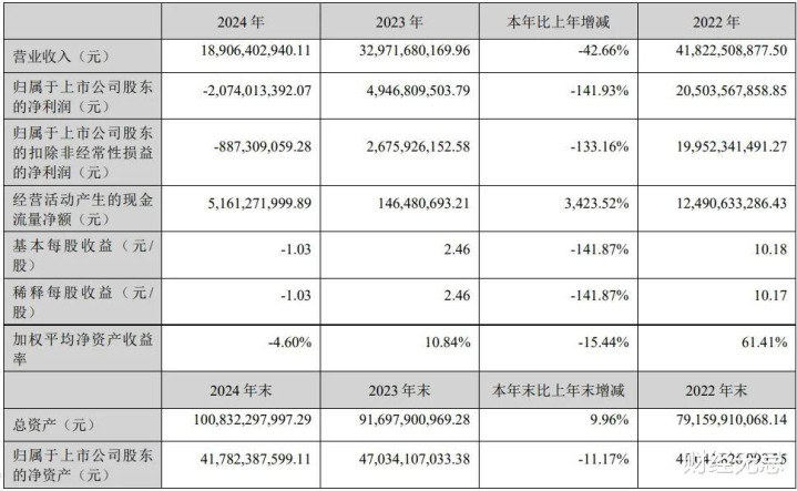 财报显示,2024年,公司实现营收189.06亿元,同比减少42.66%;净亏损20.74亿元,同比下降141.93%。